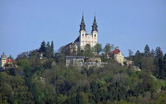 The Pöstlingberg ) is a 539 metres high hill on the left bank of the Danube in the city of Linz, Austria. It is a popular tourist destination, with a viewing platform over the city, and is the site of the Pöstlingberg pilgrimage church, and the Linz Grottenbahn.