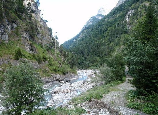 The Samina originates in Liechtenstein. In the course of time, it formed the Saminatal , the most western valley of Rätikon and side valley of the Walgau. The Saminatal makes up to one third of the territory of Liechtenstein. It has a length of approximately 17 km , Austria: 5 km ).The Samina comes into existence at Ölersegg and an exclave of Balzers), where the rivers Stägerbach and Valorschbach merge. They flow from south to north through the eastern part of Liechtenstein, the Saminatal, and then cross the border to Austria. In the community aera of Frastanz the river merges with the Ill.