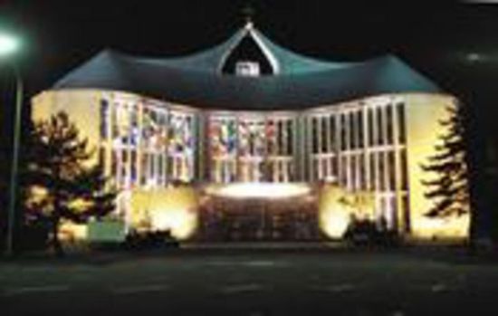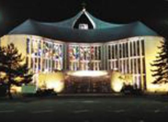 One of the most modern churches in Belgium, a cathedral of light (1958-1965), built according to the plans of architect Jozef Lantsoght (°1912-1988) from Bruges, height 40 m (tip of the cross). Roof crowning by metal artist Antoon Viaene. Main altar and figure of Christ by M. Witdouck, 752 m2 of stained glass windows in abstract style designed by J. Lefèvre and Fr. Kinnen from Luxembourg. Concrete glass of the entrance doors (210 m2) work of Gabriël Loire from Chartres. Holy water font in ceramic by R. Vandeweghe. Sister Brigitte Loire from Chartres carved the statue of Our Lady. In 1999, the interior and exterior lighting were completely modernized, as well as the sound installations. The church has 1285 seats.