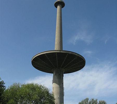 The Mechelen-Zuid water tower is a 143-metre-high , combined water and telecommunications tower constructed in 1978. Since 1979, it has supplied the water to the city of Mechelen, Belgium, while also hosting television and telecommunications aerials. The concrete spire passes through a wide disc holding water fifty metres above the ground. Higher up, a smaller disc supports telecommunications equipment. Topped by a decorative stainless steel tube, it is claimed to be the highest water tower in the world.