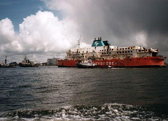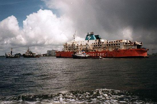 MS Herald of Free Enterprise was a roll-on/roll-off ferry which capsized moments after leaving the Belgian port of Zeebrugge on the night of 6 March 1987, killing 193 passengers and crew.The eight-deck car and passenger ferry was owned by Townsend Thoresen, designed for rapid loading and unloading on the competitive cross-channel route. As was common at the time, it was built with no watertight compartments. The ship left harbour with her bow door open, and the sea immediately flooded the decks; within minutes, she was lying on her side in shallow water. The immediate cause of the capsizing was found to be negligence by the assistant boatswain, who was asleep in his cabin when he should have been closing the bow door. However, the official inquiry placed more blame on his supervisors and a general culture of poor communication in Townsend Thoresen. The vessel was salvaged, put up for sale, and sold to Naviera SA Kingstown on 30 September 1987, renamed Flushing Range. It was taken to Taiwan on 22 March 1988 to be scrapped.