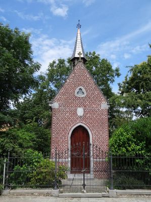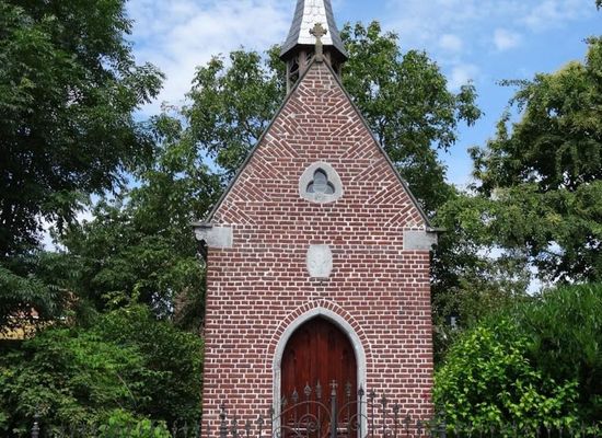 Chapel of Our Lady of the Sacred Heart built in 1886 by Dominicus Van Der Meulen and popularly known as Domientjeskapel after its founder. Chapel located in the front garden of number 40 behind a fence, initially belonging to an earlier farm of which only the altered farmhouse (number 38) remains. Neo-Gothic rectangular chapel with three-sided closure. Brick construction with use of hard stone; gabled roof (slate) topped with a six-sided wooden bell tower; slate spire crowned by an iron cross. Sharp pointed gable with braiding, hard stone top edging, profiled shoulder pieces, top cross. Framed pointed arch door; top oculus with three-pass. Beautifully whitened woodwork of double door under facade stone with the inscription O L V and a flaming heart under a crown. Pointed arch side windows; crucifix on a diamond-shaped board with a small roof against the blind back wall.