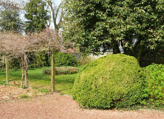 Adjacent to the 19th-century rectory, there is a large backyard from the same period. Some of the still representative original plantings have been preserved. This spherical shaved palm tree is one of them.