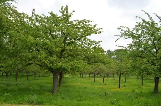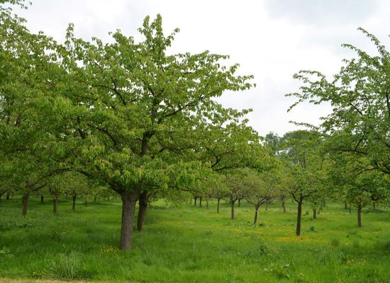 Rullingen Castle, which was converted into a Maasland-style water castle in the first half of the 17th century, is surrounded on three sides by standard orchards on the cabinet map of the Ferraris (1771 – 1778). On the Pre-primitive land register plan of 1809, a whimsically shaped pond refers, among other things, to the new park construction, in which a large orchard of approximately 2ha 23a was preserved to the south. The current orchard of approximately 5ha 39are occupies the southeastern half of the domain and has remained in continuous use as a standard orchard.