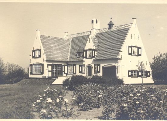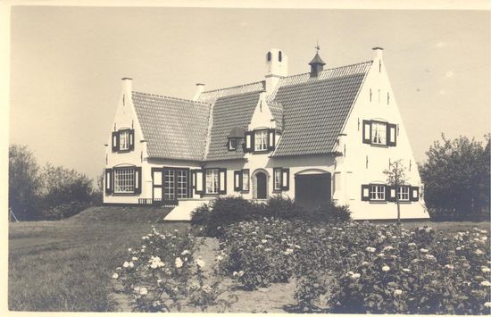 Villa so-called "Valkenhuis", beautifully situated country house on the Grote Kil in the Albertuspolder, diked in 1612, on the border with the Netherlands. Built in 1938 to a design by architect J. Loontjens (Ghent) in regionalist style referring to the local rural architecture. The formerly white-painted mansion shows a typical play of volume under tiled roofs, high gables, windows with small rod divisions and shutters and a brick-framed door, and decorative buttresses at the corners.