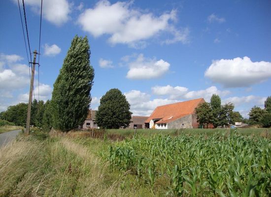No. 135. So-called "Hoeve Vandenbroucke". Stable with inscription "M I 1763" on N. side wall (before restoration said to be "MF 1763"), and barn with "HMF 1778" and heart-shaped mason's mark on N. side wall. Farm indicated on Ferraris map (1770-1778) with separate components, but with gr.m. same location and in gr.m. the same arrangement in the Atlas der Buurtwegen (1843). U-shaped farmhouse, contiguous by later extensions, low components under mainly gable roofs (Flemish tiles), including with overhanging eaves on modillons and loading window under sloping roof. Anchored red brick construction embellished with yellow stone, partly painted white on pecked plinth. Arrangement all around rechth. Courtyard with lime tree; access to the S.W. between lime trees. To the N., dwelling house of two + seven trav. with renovated yard. To the E., barn with basket-arched openings for, among other things, wagon house, bag and threshing floor, also elongated ash holes. W. volume dated 1763 on projecting part of present stable with traces of braiding, in S. stable part elongated Bohemian caps of brick on belt arches. To the S. of the barn dung heap. To the N. of dwelling house, small stable. Numerous renovations and more recent extensions.