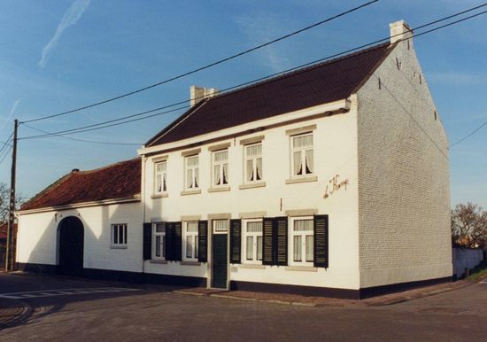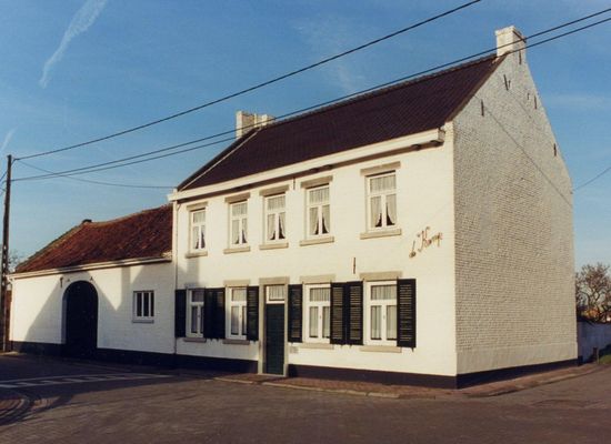 Birthplace of the historian Canon Dr. J. Coenen (1870-1958). Long stretched farmhouse from the middle of the 19th century. Farmhouse of the double house type, five bays and two storeys under gable roofs (mechanical tiles). White painted brick building on cemented plinth. Rectangular windows with hard stone lintel and leak threshold, shuttered on the ground floor Rectangular door in a hard stone frame. Side facades with roofs and braids. The service building is a wing of one storey under gable roof (Flemish tiles) adjacent to the left of the house. White painted brick building, with a round arch gate and a recent window. Left side façade with roof, braids and top piece.