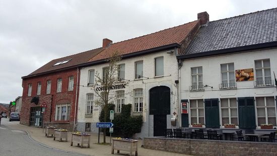 No. 4. So-called "Corneblomme., cf. inscription of façade frame. Old name, appearing in the legend of A. Sanderus' village map under point 6, "de Corne Blomme Mathematische Schole", workshop of A. Sanderus' illustrator Vaast du Plouich. Former brewery, now converted into a banquet hall-restaurant. Double house of five trav., including r.poorttrav., and two buildings. under gable roof (n // street, mechanical tiles); year stone 1877 in keystone of gate. Brick construction with white painted façade on grey-painted plinth. Four right. to slightly arched, barred cellar openings. Elevated ground floor. Slightly arched window openings under extended lintel: originally shuttered lower windows (cf. thumbs) with small rod division; renewed upper windows; tiled leak thresholds. Basket arch gate in flat frame; low frame door between brick wall dams at the bottom.