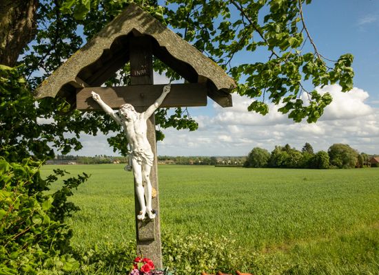 In the Lampestraat we find this wooden cross at the three-village point of Rollegem, Aalbeke and Marke. From here you have a beautiful view of the surroundings. Soon we will arrive at the highest point of the walk where we have a fantastic panorama all around.
