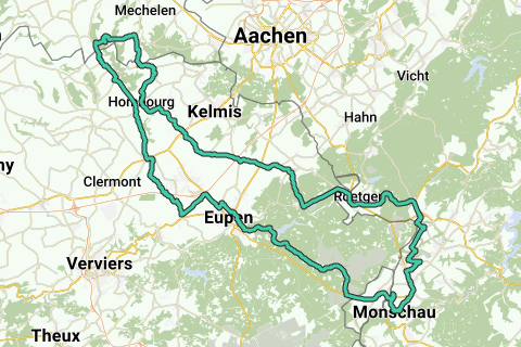 Round trip Heijenrath-Monschau-Heijenrath 4. Start/finish: gasterij de Zegelskoel, Heijenratherweg 22, Slenaken-Heijenrath. Ascents: Smidsberg Epen 1,500 m., max. 7.0%. Rue de Sipenaeken Sippenaeken (B) 2.600 m., max. 8.0%. Rue de Birken Montzen (B) 600 m., max. 6.0%. Montzener Strasse Montzen (B) 650 m., max. 5.0%. Montzener Strasse Busch (B) 700 m., max. 5.0%. Schloss Strasse Lontzen (B) 1,000 m., max. 9.0%. Meroler Strasse Walhorn (B) 1,400 m., max. 5.0%. Vennkreuz Raeren (B) 4,200 m., max. 8.0%. Eicherberg (partly) Eupen (B) 650 m., max. 11.0%. Côte de Henri-Chapelle (in part) Henri-Chapelle (B) 200 m., max. 6.0%. Loorberg Slenaken 1,500 m., max. 8.0%. In the route there are also several unnamed climbs. Elevation 1,299. Coffee stop: Café Kaulard, Markt 8, Monschau (D). (opening hours to come)