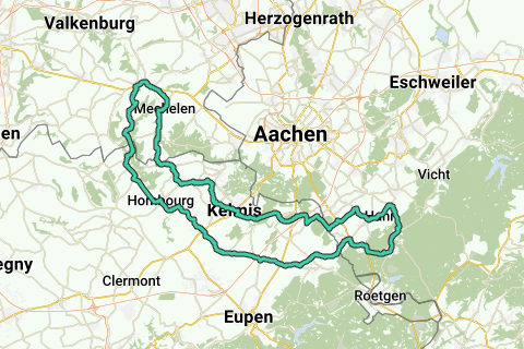 Round trip Gulpen-Mulartshütte-Gulpen. Start/finish: Marktstraat/Rijksweg Gulpen. Elevation difference: Roodweg Epen 400 m., max. 8.0%. Epen Smidsberg 1,500 m., max. 7.0%. Rue de Lattenheuer Plombières (W) 1.100 m., max. 9.0%. Belle-Vue Plombières (W) 1.200 m., max. 10.0%. Rue de Viaduc Moresnet (W) 600 m., max. 9.0%. Bachstrasse Kelmis (B) 700 m., max. 12.0%. Buschhausstrasse (partly) Hauset (W) 450 m., max. 5.0%. Freyenter Wald Lichtenbusch (W) 600 m., max. 8.0%. Aachener Strasse Walheim (D) 800 m., max. 9.0%. Mulartshütter Strasse Venwegen (D) 1.900 m., max. 8.0%. Quiriniusstrasse (partly) Rott (D) 900 m., max. 9.0%. Rottendell Rott (D) 600 m., max. 12.0%. Rue de Hombourgh Montzen (W) 2.100 m., max. 7.0%. Gieveld Teuven (W) 1.500 m., max. 6.0%. In the track also several climbs without name. Altimeters: 987. Coffee stop: restaurant Birkenhof, Mulartshütter Strasse 20, Stolberg-Venwegen (D) (Monday closed)
