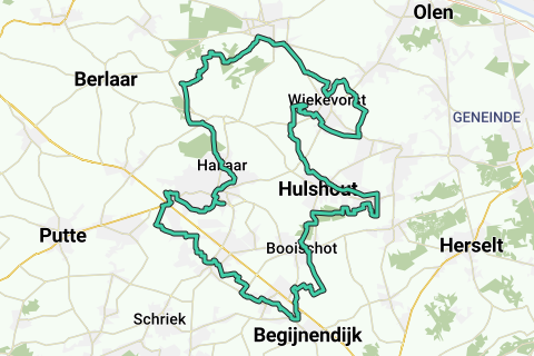 The cycling route starts at the Hof Van Riemen, the oldest still existing civil building in Heist-op-den-Berg. We are 1 km in when we ride over the Heist berg. We descend towards Hallaar. From the center of Hallaar, we continue towards the Provincial Green Domain De Averegten. We are then 4 km into the ride. Via the Langendijk, we leave De Averegten and arrive in Itegem. We pass by the center of Itegem on our left. We pass Castle la Garenne, and we are then 6 km in. Along quiet roads, we ride towards the River Nete. At the Nete, we find brasserie 't Schipke, which puts us at 10 km. After this, we cycle through the valley of the River Wimp towards the rural Wiekevorst. Upon arriving in Wiekevorst, we encounter the Wimpelhoeve. We make a detour around the center of Wiekevorst via narrow rural roads with an open landscape. Just before we leave Wiekevorst, we come across Klein Scherpenheuvel. This place of worship owes its name to its striking resemblance to the Basilica of Scherpenheuvel. Just like the Basilica, the dome of the chapel in Klein Scherpenheuvel is also adorned with stars. We leave Wiekevorst, and at kilometer 29, we pass the Kaasstrooimolen in Hulshout. Also in Hulshout, we drive through the village center via quiet roads. Ultimately, we arrive at kilometer 32 at the Kempen-Hageland route bike path, a former railway bed. We follow this bike path for a kilometer. Then, some quiet roads lead us after 36 km to the Herenbossen. We ride through the forests and emerge on the Booischotseweg. We briefly ride in the direction of Booischot and pick up the path along the River Nete again at brasserie De Pallieterhoeve. We ride past the castle domain Hof ter Laken to the center of Booischot. From the center, we take some quiet roads towards Booischot-Station. At the station, we are 44 km in. We continue down the road towards Begijnendijk. We ride through the recreation forest Bieheide and are 45 km into the ride. We then pass through the villages of Pijpelheide (47 km in) and Heist-Goor (50 km in). At kilometer 55, there is Het Pelgrimhof. This is a medieval fiefdom with a moat and wooded park, located near the border with Beerzel. From here, we cycle back to Heist-op-den-Berg. After 60 km, we return to our starting point, the Hof Van Riemen.