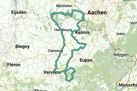 Start/finish: Gasterij de Zegelskoël, Heijenratherweg 22, Slenaken-Heijenrath. Ascents: West Cameroon Vijlen 4,400 m., max. 8.0%. Oude Akerweg Vaals 700 m., max. 12.0%. Viergrenzenweg/Vaalserberg Vaals 2,400 m., max. 10.0%. Rue de Moresnet Moresnet (B) 900 m., max. 6.0%. Village Street/Langhaag Moresnet Street (B) 800 m., max. 11.0%. Montzener Strasse Montzen (B) 600 m., max. 5.0%. Montzener Strasse Busch (B) 700 m., max. 5.0%. Schloss Strasse Lontzen 1,000 m., max. 7.0%. Rabotraterstrasse (partly) Rabotrath (B) 300 m., max. 7.0%. Limburg Wall Limburg (B) 2,000 m., max. 13.0%. Côte d'Hèvremont (partly) Hèvremont (B) 1,200 m., max. 6.0%. Côte d'Hèvremont (partly) Goë (B) 2,600 m., max. 4.0%. Renoupré ramp (partly) Dison (B) 1,600 m., max. 8.0%. Rue de Verviers Henri-Chapelle (B) 2,100 m., max. 6.0%. Loorberg Slenaken 1,500 m., max. 7.0%. There are also several unnamed climbs in the route. Elevation gain: 1,402. Coffee stop: Le Grand Charmont, Place Léon d'Andrimont 35, Limbourgh (B) (open every day)