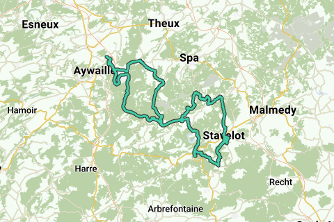 Forse Ardense tour with some of the most famous climbs from La Doyenne. Start in Remouchamps; follow the Amblève to Trois-Ponts; from there over Mont-de-Fosse to St-Jacques, le Grand Halleux, and so on to the Côte de Wanne. From Wanne down to Stavelot, and immediately back up to Stockeu. Again down to Stavelot and continue towards Spa. After about 3.5 km left to Neuville, then left to Ruy, and from there right to climb up the Rosier. At the top, turn left and down to La Gleize. At the bottom, follow the road to Stoumont and there at the junction right (Au Vieux Moulin) to climb up to Haut-Desnié. Continue to La Reid, and from there back to Remouchamps to top it all off by climbing the Col de la Redoute.
