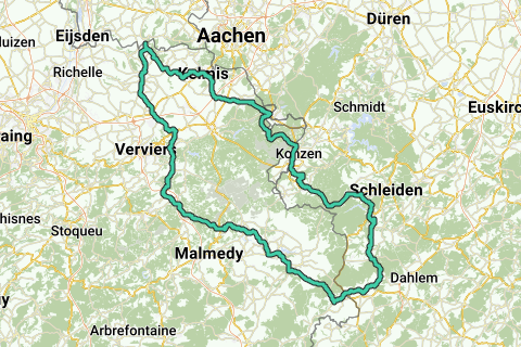 Teuven – Hombourg – Montzen – Moresnet – Kelmis – Hergenrath – Astenet – Walhorn – Belven – Neudorf – Petergensfeld – Entenpfuhl – Monschau – Heidgen – Höfen – Rohren – Rothe Kreuz – B258 – Schöneseiffen – Harperscheid – L159 – Hellenthal – Hönningen – Rescheid – Etscherath – Berk – Frauenkron – Scheid – Losheim – Hüllscheid – Merlscheid – Lanzerath – Buchholz – Honsfeld – Bütgenbach – Weywertz – Robertville – Longfaye – Hockai – Cokaifagne – Le Wayai – Sart-lez-spa – Tiège – Surister – Hèvremont – Halloux – Limbourg – Dolhain – Bilstain – Quatres Chemins – Elsaute – Clermont – Froidthier – Aubel – Hagelstein – Rode Bos – Teuven. Teuven – Hombourg – Montzen – Moresnet – Kelmis – Hergenrath – Astenet – Walhorn – Belven – Neudorf – Petergensfeld – Entenpfuhl – Monschau – Heidgen – Höfen – Rohren – Rothe Kreuz – B258 – Schöneseiffen – Harperscheid – L159 – Hellenthal – Hönningen – Rescheid – Etscherath – Berk – Frauenkron – Scheid – Losheim – Hüllscheid – Merlscheid – Lanzerath – Buchholz – Honsfeld – Bütgenbach – Weywertz – Robertville – Longfaye – Hockai – Cokaifagne – Le Wayai – Sart-lez-spa – Tiège – Surister – Hèvremont – Halloux – Limbourg – Dolhain – Bilstain – Quatres Chemins – Elsaute – Clermont – Froidthier – Aubel – Hagelstein – Rode Bos – Teuven.
