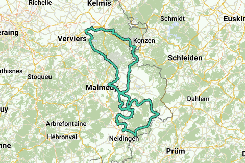 Membach – Eupen – Unterstadt – Wesertalsperre – Neu-Hattlich – Brackvenn – L214 – Weilersbroich - Eschweide – Leyloch – Kalterherberg – Leykaul – N669 – Am Grûnen Koster – Weywertz – Faymonville – Steinbach – Ondenval – Am Kreuz – Iveldingen – Montenau – Deidenberg – Amel – Valender – Meyerode – Medell – Hochkreuz – Born – Nieder Emmels – Hünningen – Wallerode – Sankt Vith – Schlierbach – Alfersteg – Setz – Atzerath – Heuem – Schönberg – Andler – Andlermüle – Manderfeld – Holzheim – Honsfeld – Heppenbach – Möderscheid – Amel – Schoppen – Faymonville – Waimes – Libomont – G’Doumont – Walk – Robertville – Ovifat – Sourbrodt – Signal de Botrange – Baraque Michel – Herbiester (Jalhaye) – Lac de la Gileppe – Goé – Dolhain - Membach.