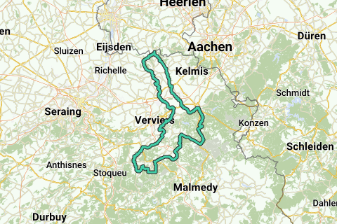 S.M.V. – ΔVeurs – Remersdaal – Hombourg (Δ Gulpenmeule) – Henri-Chapelle – left, right – roundabout – right – Welkenraedt – Lantzenberg – Heggen – Baelen – Membach (35) – straight ahead 39 – Δ 38 descend to the roundabout right (40) – (Δ 58) – (Δ 57) – (59) – (61) large road left towards Baraque Michel – turn right onto Belle Croix – Jalhay – Solwaster – Sart – Tiège – Neufmarteau – Jehanster – Sècheval – Halleur – Hèvremont – Halloux – Dolhain – Bilstain – Elsaute – Clermont – Winandchamps – Longue Haie – Aubel – Magis – S.P.V. – S.M.V.