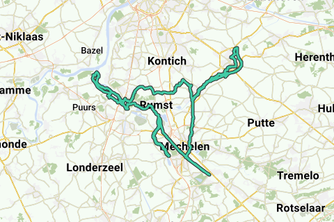 Starting from the Church in Reet, we seek out all the flowing water. Along rivers and canals. First via Duffel to Lier. Back via Duffel to Mechelen. Heading towards Leuven, but we turn back towards the Zennegat. Then to Willebroek to see the Scheldt at the locks. On the way back to the starting point, we go through Boom and pass the Schorre.