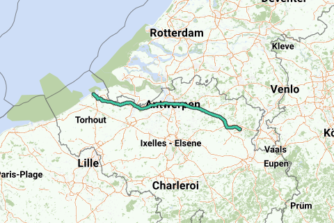Blankenberge via Zelzate, Stekene, Beveren, pedestrian tunnel St Anna, Antwerp, Rivierenhof, the Albert Canal to Herentals, Kwaadmechelen, Beringen. Via Bolderberg, Zonhoven to Genk Boxbergheide.