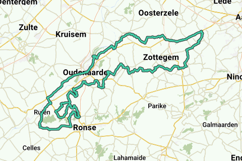 Beautiful hilly route through the landscapes of the Ronde van Vlaanderen, with the Eikenberg and Kluisberg as official climbs, but also many other lesser-known hills. Passing through the last 10 km of the Ronde route and passing through the market of Oudenaarde.