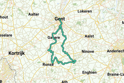 The route begins at Café Pedaleur de Flandres. It leads over Merelbeke, Zwalm to the wall of Geraardsbergen. After the wall, we ride to La Houppe and into the Music Forest, to reach the market of Oudenaarde. The final stretch leads back over the Schelde.