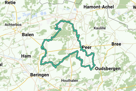 Pelt, Eksel, Wijchmaal, Peer, Meeuwen, Hechtel, Koersel, Stal, Korspel, Beverlo, Leopoldsburg, and Lommel-Kerkhoven. You mainly ride through forests and fields along the junctions. Villages are avoided as much as possible. Therefore, there are deviations from the network of junctions here and there. You ride a total of 90 kilometers on paved, low-car or car-free roads with a limited number of elevation meters.