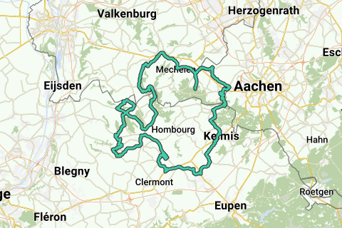 Round trip Heuvelland 17 from Vijlen. Start/finish: forest café 't Hijgend Hert, Rugweg, Vijlen. Climbs: Loorberg Slenaken 1,500 m., max. 8.0%. Dorpsstraat/Kultjen Remerdael (B) 2,400 m., max. 7.0%. Kwinten/Op de Eiken St. Martens-Voeren (B) 1,800 m., max. 8.0%. Zwaen/Rullen/Brabant St. Pieters-Voeren (B) 1,000 m., max. 14.0%. Bois d'Ansy Aubel (B) 1,300 m., max. 6.0%. Côte de Hagelstein Aubel (B) 1,100 m. max. 6.0%. Rue Les Trois Bornes Gemmenich (B) 2,200 m., max. 6.0%. Lemiersberg Lemiers (D) 900 m., max. 12.0%. Mamelisserweg/ Vijlenberg/Rugweg Vijlen 3,200 m. max. 8.0%. Elevation gain: 1,318. Coffee stop: Les élevages du Moulin du Val Dieu, Val Dieu 298, Aubel (B) (closed on Mon/Tue) or restaurant of Abdij Val-Dieu, Val-Dieu 227, Aubel (B) (closed on Tue during summer months and also closed on Mon during winter months).