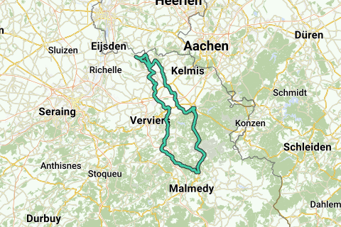 S.M.V. – ΔVeurs – Remersdaal – Hombourg (Δ Gulpenmeule) – Henri-Chapelle – left, right – roundabout – right – Welkenraedt – Lantzenberg – Heggen – Baelen – Membach – Eupen - right towards Baraque Michel – Belle Croix – Baraque Michel – Mont Rigi – Xhoffraix – (53) – (75) – (73) Hockai – Sart – Tiège – Troisfontaines – Surister – Vervifontaine – Louveterie – Hèvremont – Limbourg – Δ Dolhain – Bilstain – Elsaute – Clermont – Long Haye – Old Mother - slaughterhouse– Hagelstein – Rodebos – De Plank - S.M.V.