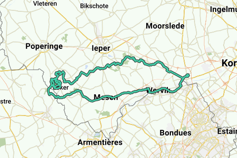 From Menen, it goes towards Geluwe (Moeremaai) and from there slightly hilly towards Kruiseke and Geluveld. The course becomes a bit bumpier around St Elooi, Voormezele. We also pass a number of historical sites from World War I like Hill 62 and Hill 60 around ZIllebeke. At Klijte, we start the real work with the Scherpenberg. From here, we descend towards Reningelst, which we leave to the right :-). From Westouter, we take on the Sulferberg and further climb the slope via the Pleute, a winding alternative through a little forest... We cross the road and at the beautiful church of Loker, we turn right and climb the schomminkelstraat but now from Westouter (in 1.51km we rise from 49 to 112m). We continue our way towards Rodeberg, descending via the Sulfer to Westouter and now climbing the Vidaigneberg (between Rodeberg and Zwarteberg, in 1.90km we rise from 49 to 138m). Next, we head towards Zwarteberg, which we enter at Croix de Poperinge towards Tere Plekke (Guesnestraete), koudekotstraat, Lettingstraat, indeed the Monteberg which takes us over 1km from 45m high to 108m. Enthusiasts can climb the Kemmelberg again (but it is not in the route), from here we descend via Gremmerslinde to Wulvergem, and if the wind is favorable, this is a nice road to gain speed via Kraaiberg, Mesenberg to Mesen. The road continues towards Komen, Wervik, Leie, Menen