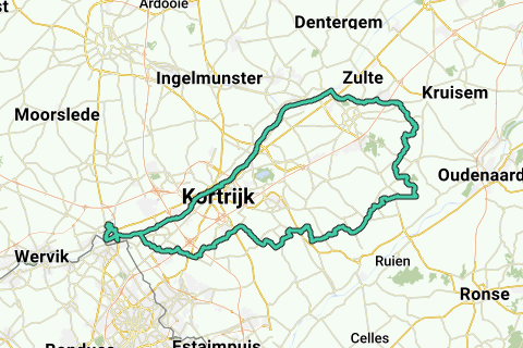 The first 35 km are slightly hilly. In Tiegem we can test our legs for the first time - we take the Hellestraat/Meuleberg and continue towards Gijzelbrechtegem. There we do not take the traditional climb, but the Hollestraat/Bosstraat where we can enjoy the 'green' surroundings. From there we head towards Nokere where we bump over the cobblestones in the Nokeredorpstraat. From there we descend towards St. Eloois Vijve, where we can tackle the last 25 km along the Leie, with the wind at our backs towards Menen.