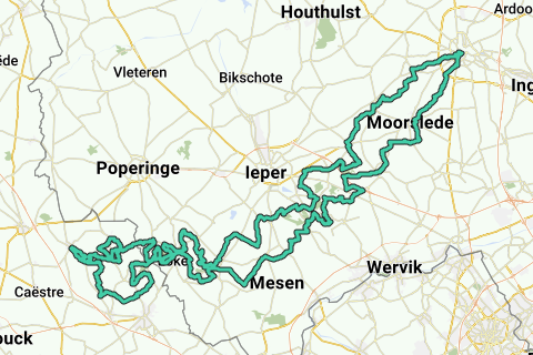 Through deserted roads, you reach forgotten villages like 'Hollebeke and Geluveld'. Along forests and nature domains, you cycle to 'Beselare and Moorslede'. From Moorslede, it's downhill to Roeselare. Along the buildings of 'Roularta', you reach the finish at 'KOERS'. This ride has 1567Hm.