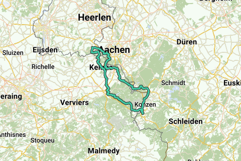 Vijlen-Monschau-Vijlen 4. Start/finish: boscafé 't Hijgend Hert, Rugweg, Vijlen. Ascents: Vaals border - Karlshöher Talweg/Lütticherstrasse junction Aachen (D) 87 metres of climbing over 7,000 m. Petergensfeld Raeren (D) 3,400 m., max. 12.0%. Vennbahn trajact Roetgen-Entenpfuhl (D) 133 meters false flat for 17 km. Eupenerstrasse Mützenich (D) 2,300 m., max. 9.0%. Chemin du Duc Gemmnich (W) 1,200 m., max. 12,0%. Camerig oost Vaals 1,600 m., max. 12.0%. In the Voer region and the foothills of the Eifel, several altimeters have to be overcome. However, these do not have a name. Altimeters 1,150. Coffee stop: café Kaulard, Markt 8, Monschau (D).