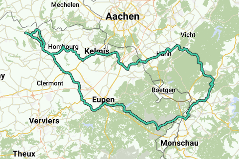 S.M.V. – Veurs – Hagelstein – Merkhof – Hombourg – Montzen – Lontzen – Kelmis – Hergenrath – Hauset – Eynatten – Sief – Walheim – Hahn – Venwegen – Zweifall – Raffelsbrand – Rollesbroich – Paustenbach – Hoscheit – Entenpfuhl (24) – (51) – (52) – (53) – (54) – (55) – (41) – (40) – (39) – Membach (35) – Baelen – Heggen – Welkenraedt – Henri-Chapelle – Merkhof – Hagelstein – De Plank – S.M.V.