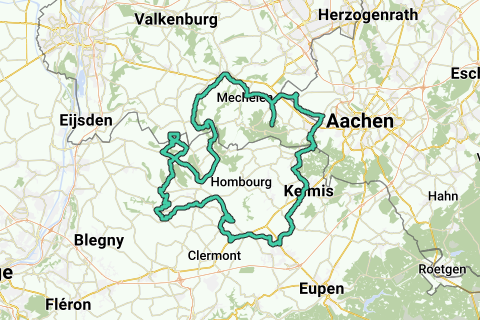 Round trip Heuvelland 57 from Vijlen. Start/finish: forest café 't Hijgend Hert, Rugweg, Vijlen. Climbs: Lemiersberg west (Kühlweg) Lemiers (D) 1,600 m., max. 8.0%. Schneeberg Lemiers (D) 1,900 m., max. 9.0%. Kerkstraat/ Viergrenzenweg Vaals 3,100 m., max. 8.0%. Schnellenberg Kelmis (B) 1,900 m., max. 8.0%. Montzener Straße Busch (B) 700 m., max. 5.0%. Rue de la Vallée Henri-Chapelle (B) 2,600 m., max. 6.0%. Birven Aubel (B) 1,400 m., max. 11.0%. Côte de St. Jean-Sart (partly) St. Jean-Sart (B) 2,900 m., max. 6.0%. Krindaal/de Planck Veurs (B) 1,700 m., max. 7.0%. Magnebos Veurs (B) 2,200 m., max. 9.0%. Gieveld Teuven (B) 1,500 m., max. 6.0%. Elevation: 1,370. Coffee stop: Les élevages du Moulin du Val Dieu, Val Dieu 298, Aubel (B) (closed Mon/Tue) or restaurant of Abbey Val-Dieu, Val-Dieu 227, Aubel (B) (closed Tue in summer months / also closed Mon in winter months).