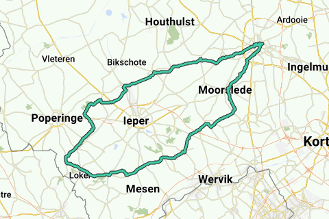 Route: Roeselare, Westrozebeke, Langemark, Boezinge, Vlamertinge, Westouter, Kemmel, Wijtschate, Hollebeke, Zandvoorde, Geluveld, Beselare, Slypskapelle, Moorslede, Roeselare