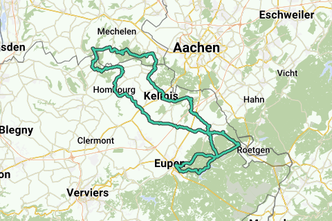 Start/finish: Gasterij de Zegelskoël, Heijenratherweg 22, Slenaken-Heijenrath. Ascents: Camerig West Vijlen 4,600 m., max. 8.0%. Wolfhaag Pass Vaals 1,900 m., max. 10.0%. Vennkreuz Neudorf (B) 3,600 m., max. 8.0%. Rue de Beusdael Sippenaeken (B) 2.800 m., max. 8.0%. Gieveldstraat Teuven (B) 1,500 m., max. 6.0%. There are also several unnamed climbs in the route. Metres above sea level: 1,275. Coffee stop: Restaurant Wesertalsperre, Langesthal 164, Eupen (B) (open daily).