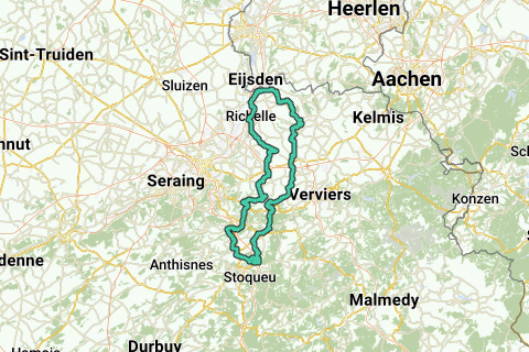 via Warsage, Heye, St-Jansrade, Val Dieu, Charneux, Herve, Bruyère, Soiron, Vaux-sous-Olne, Nessonvaux, Banneux, Louveigné, Cornemont, La Redoute, Sprimont, Dolembreux, Trooz, Soumagne, Bolland, Blegny, Richelle and Visé