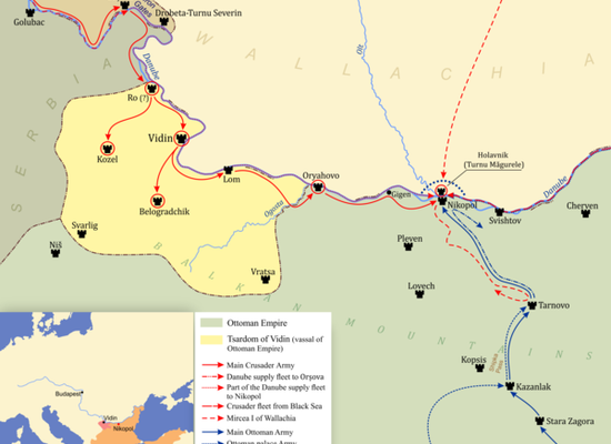 The Battle of Nicopolis took place on 25 September 1396 and resulted in the rout of an allied crusader army of Hungarian, Croatian, Bulgarian, Wallachian, French, Burgundian, German, and assorted troops at the hands of an Ottoman force, raising the siege of the Danubian fortress of Nicopolis and leading to the end of the Second Bulgarian Empire. It is often referred to as the Crusade of Nicopolis as it was one of the last large-scale Crusades of the Middle Ages, together with the Crusade of Varna in 1443–1444.
