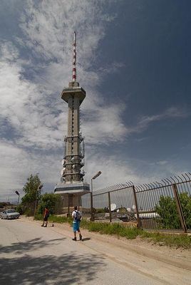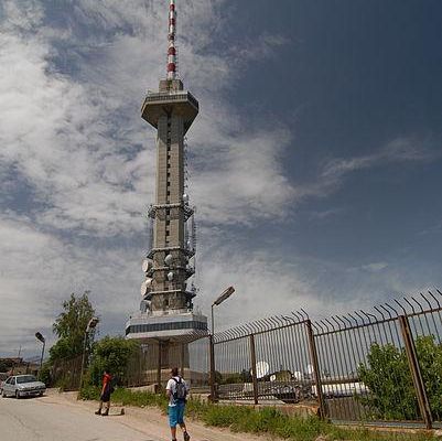 Vitosha Mountain TV Tower, better known as Kopitoto after the rock outcrop it stands on, is a 186-metre tall TV tower built of reinforced concrete on Vitosha Mountain near Sofia, Bulgaria. The footprint of the tower has the shape of a hexagon with three of the sides extended . From the tower there is a commanding view of Sofia, and the tower can be seen from everywhere in Sofia, making it a landmark of Sofia's skyline. It is the second tallest television tower in Bulgaria.
