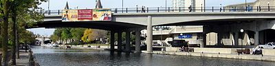 The Mackenzie King Bridge is a bridge in Ottawa, Ontario, Canada. Just a few blocks away from Parliament Hill, south of the Plaza Bridge, it runs in a generally east-west direction, with the east end at the Rideau Centre and Department of National Defence Headquarters. The west end runs between the National Arts Centre and Confederation Park. It was named for William Lyon Mackenzie King , Canada's longest-serving prime minister and was opened to traffic in 1951. A major restoration effort was completed in 1996-1998.