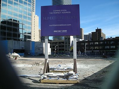 One Bloor, previously One Bloor East and Number One Bloor, is a mixed-use skyscraper under construction at the intersection of Bloor Street and Yonge Street in downtown Toronto, Ontario, Canada. The project was initially launched by developer Bazis International Inc. in 2007, before being cancelled and re-developed under developer Great Gulf Homes. The two-storey buildings located on the site were demolished in December 2008. The 75-storey tower topped out in late 2015.