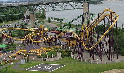 Le Vampire is an inverted roller coaster at La Ronde amusement park in Montreal, Quebec, Canada, designed by the Swiss firm Bolliger & Mabillard . It is a mirror image of Batman: The Ride, however since this is not a branded Six Flags park, Six Flags' licensing agreement with Warner Bros. and DC Comics is not valid. As a result, the roller coaster has no association to the Batman media franchise and was given an unrelated name and a slightly different cosmetic appearance. The track is 823 metres in length and reaches a height of nearly 32 metres. Riders sit with their legs dangling such as on a ski chairlift and reach speeds of up to 80.5 km/hour and loop head-over-heels five times. The Vampire can carry up to 1,400 riders per hour.