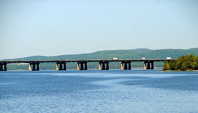 The Île aux Tourtes Bridge is a bridge on the western tip of the Island of Montreal, spanning the Lake of Two Mountains between Senneville, and Vaudreuil-Dorion, Quebec, Canada. It carries 6 lanes of Autoroute 40 and is the main link between Montreal and the province of Ontario. At 2 km in length, it is by far the longest bridge in Quebec to cross a body of water other than the Saint Lawrence.