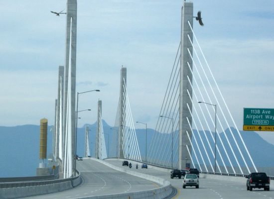 The Golden Ears Bridge is a six-lane extradosed bridge in Metro Vancouver, British Columbia. It spans the Fraser River, connecting Langley on the south side with Pitt Meadows and Maple Ridge on the north side. The bridge opened to traffic on June 16, 2009. The bridge replaced a previous ferry service several kilometers upstream and will be run by a private consortium, the Golden Crossing General Partnership, until June 2041.