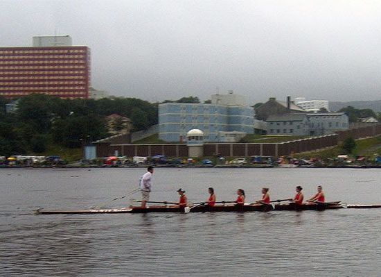 Quidi Vidi Lake is a 1,600 m long body of water located at the east end of the city of St. John's, Newfoundland, Canada. The lake has a long history of hosting sporting events, including the annual Royal St. John's Regatta, said to be the oldest continuous sporting event still held in North America. The former Pepperrell Air Force Base was located on the north shore of this lake and Virginia Waters, a stream which meandered through the air base, flows into Quidi Vidi Lake. The South shore of the Lake has a number of residential and apartment complexes. A number of cultural events are held at Lakeside.