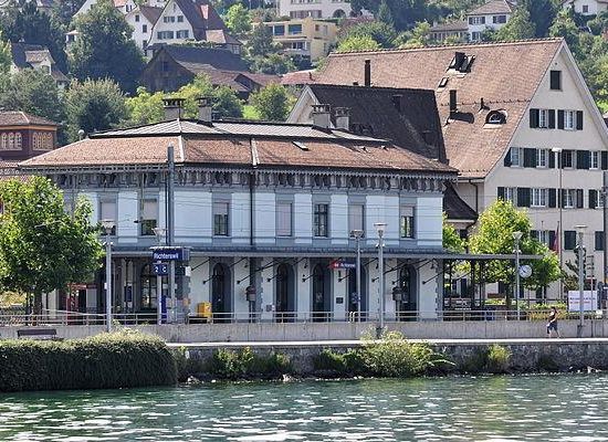 canton of Zürich, Switzerland. It is owned and operated by Swiss Federal Railways, and forms part of the Lake Zürich left-bank railway line. The station is situated at the south-eastern edge of the town centre, on the shore of Lake Zürich a short distance to the south of the Zürichsee-Schifffahrtsgesellschaft ferry terminal.