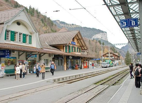 Lauterbrunnen is a railway station in the village and municipality of Lauterbrunnen in the Swiss canton of Bern. The station is on the Berner Oberland Bahn , whose trains operate services to Interlaken Ost. It is also the valley terminus of the Wengernalpbahn , whose trains operate to Kleine Scheidegg via Wengen, and of the Bergbahn Lauterbrunnen-Mürren , whose hybrid cable car and rail link runs to Mürren.