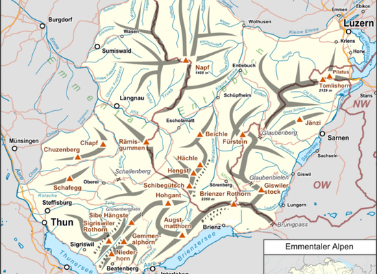 The Emmental Alps are separated from the Bernese Alps by the Aare valley to the south and connected to the Uri Alps by the four lakes Lungerersee, Sarnersee, Wichelsee, and Vierwaldstättersee to the east.