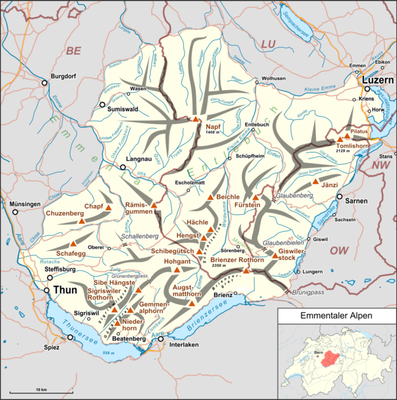 The Emmental Alps are a mountain range in the western part of the Alps, in Switzerland. They are located north-west of the Brünig Pass, mainly in the cantons of Lucerne, Bern, and Obwalden, with a small portion in the canton of Nidwalden. The highest summit of the range is the Brienzer Rothorn, which is also the highest point in the canton of Lucerne. The range is named after the Emme valley . In the north-west corner one finds the relatively low, but widespread, and very furrowed Napf.
