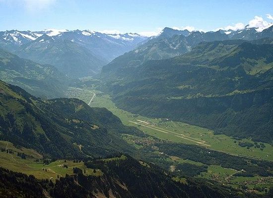 The airfield is situated in the steep-sided alpine valley of the Aar river, with its single runway parallel to the river. It is flanked to the north by the main road to Meiringen, the river, and the Brünig railway line. To the south, taxiways connect the airfield to aircraft caverns built within the valley side.
